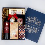 Wino czerwone wytrawne, kawa mielona Kaldi Coffee oraz praliny Lindor i Ferrero Rocher - świąteczny zestaw dla klientów i partnerów biznesowych.