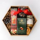 Herbata zimowa i żurawina w czekoladzie Divine Chocolate — ekologiczny, słodki zestaw bez alkoholu dla firm na święta, dla klientów i pracowników.